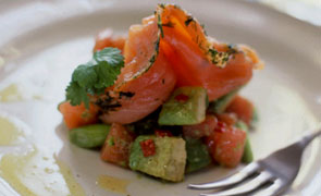 Avocado und Tomatensalsa auf einem Teller anrichten, mit dem Lachsscheiben garnieren und mit der Zitronensosse begiessen.